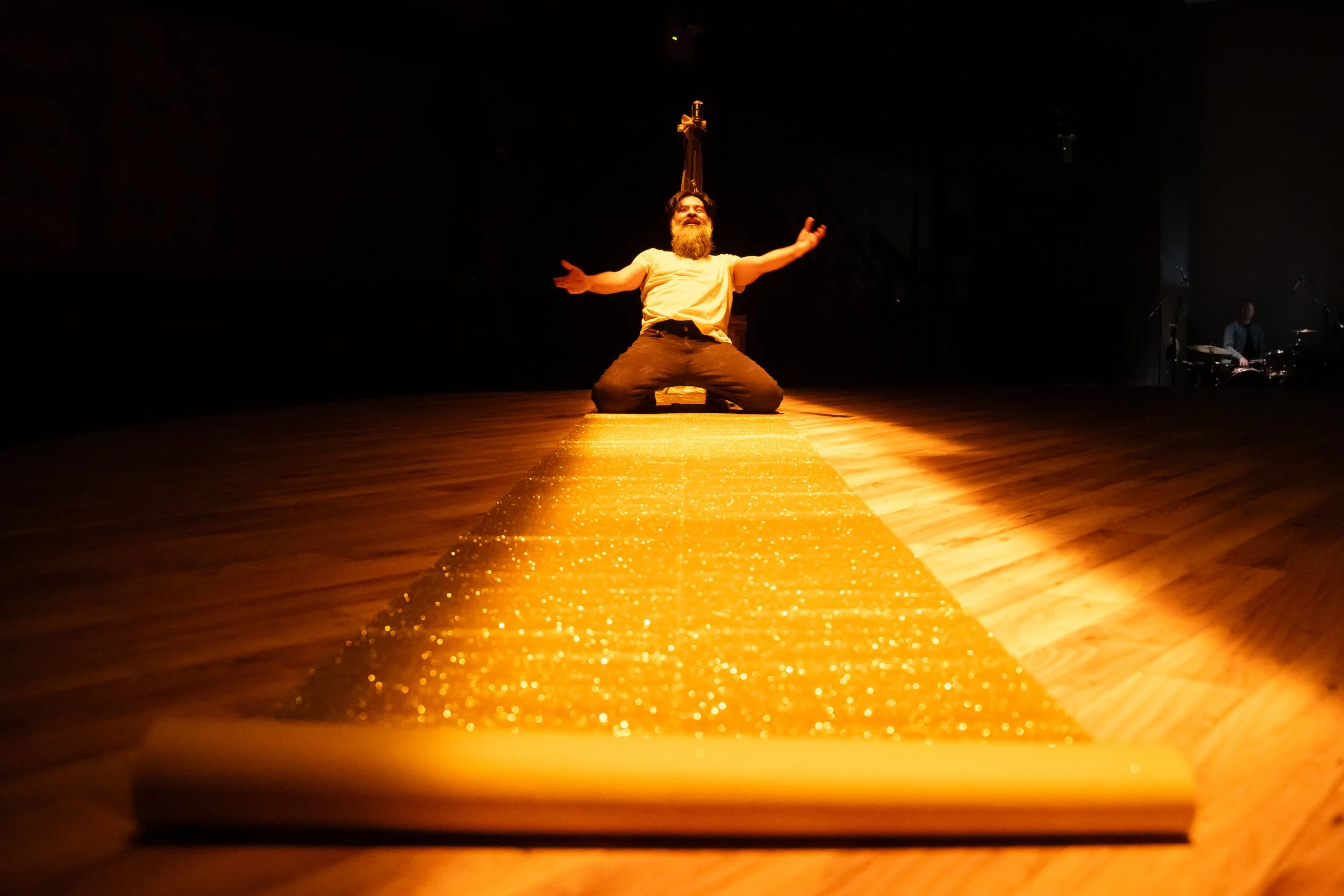 I think we we work in teams even if creating is a solitary act. The first people you share it with are the collaborators, right? So I feel lucky to have shared it with people that believed in it along the way and then added their instincts and their questions and their critiques and their shaping from the earliest collaborators like Jeanette [Oi-Suk Yew]. We were hanging out in Mana Contemporary, doing a workshop in 2019 of this piece. And after the one-day workshop with two days of prep, I remember being moved to tears, because here I was performing a piece that I didn't know that well. It wasn't in my body, but I thought, okay, I gotta put something up. And so I'm rolling around the table, and Jeanette is lighting me. She's walking around with a flashlight, pointing it in my face. Trusting someone to do something with this. I can only take it so far, I have an idea, we're just going to try it. And then get gritty, get your hands dirty and just do something. And how that process evolves with time, patience, and money into a thing that is more fully realized by more people: technicians who support associates who can execute; programmers who can make the MIDI triggers accurate. It all stems from a place of “here's as good an idea as I can make. I've thought about a lot of this, but not everything. Help.” And, and then someone takes it, smacks it one way or bumps it one way, and that's the oldest collaborator. And then Kristin [Marting], somewhere in the middle. After I abandon the project, she comes into it, and looks at the libretto, and says, this could be something more. And pushes me to rethink it and remake it. And at every moment, at every workshop, talking about: connect. How is this connecting to the ideas before and after, but also to the audience. How you transmitting this story? How are you translating and transmitting? And that completely reshapes it.