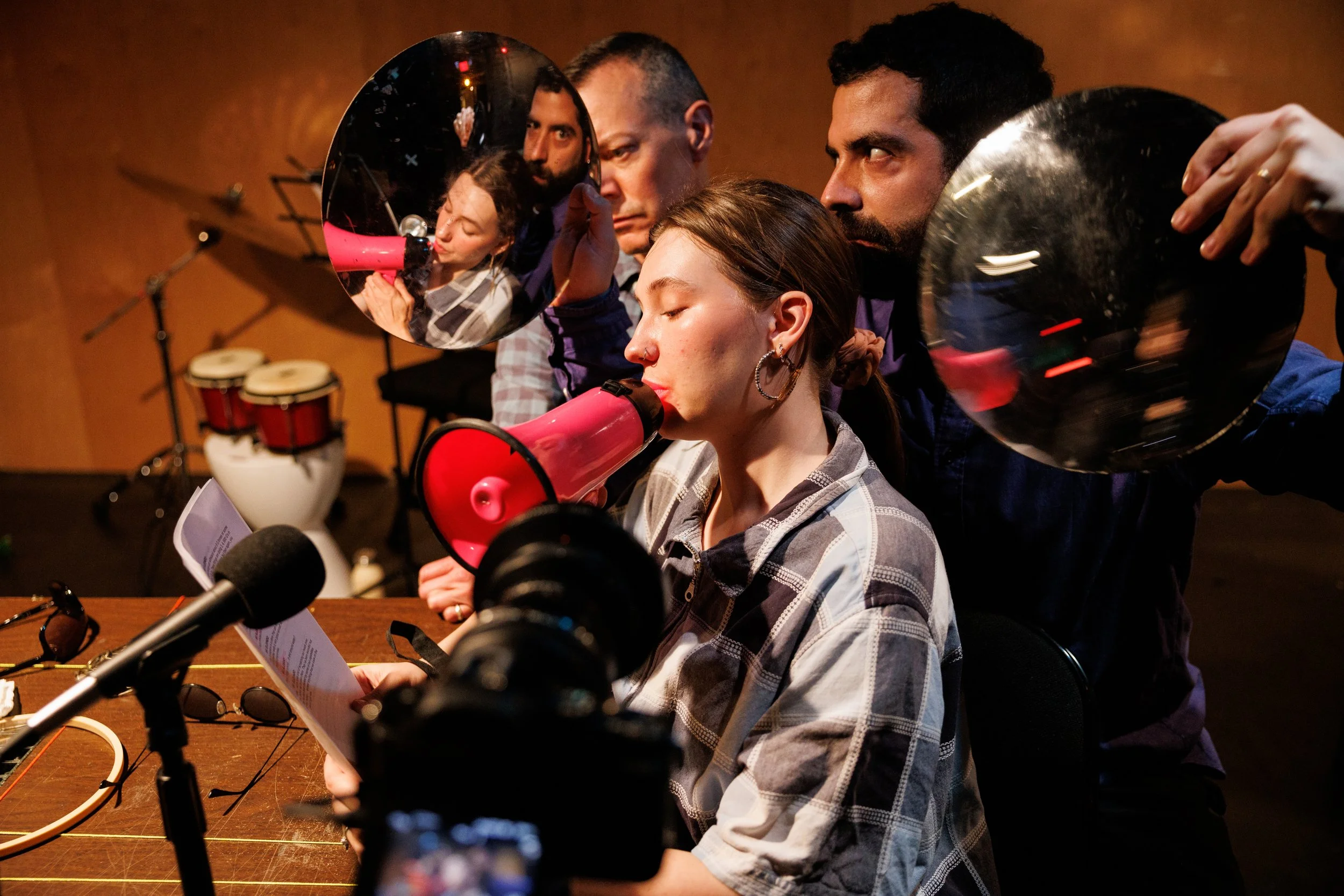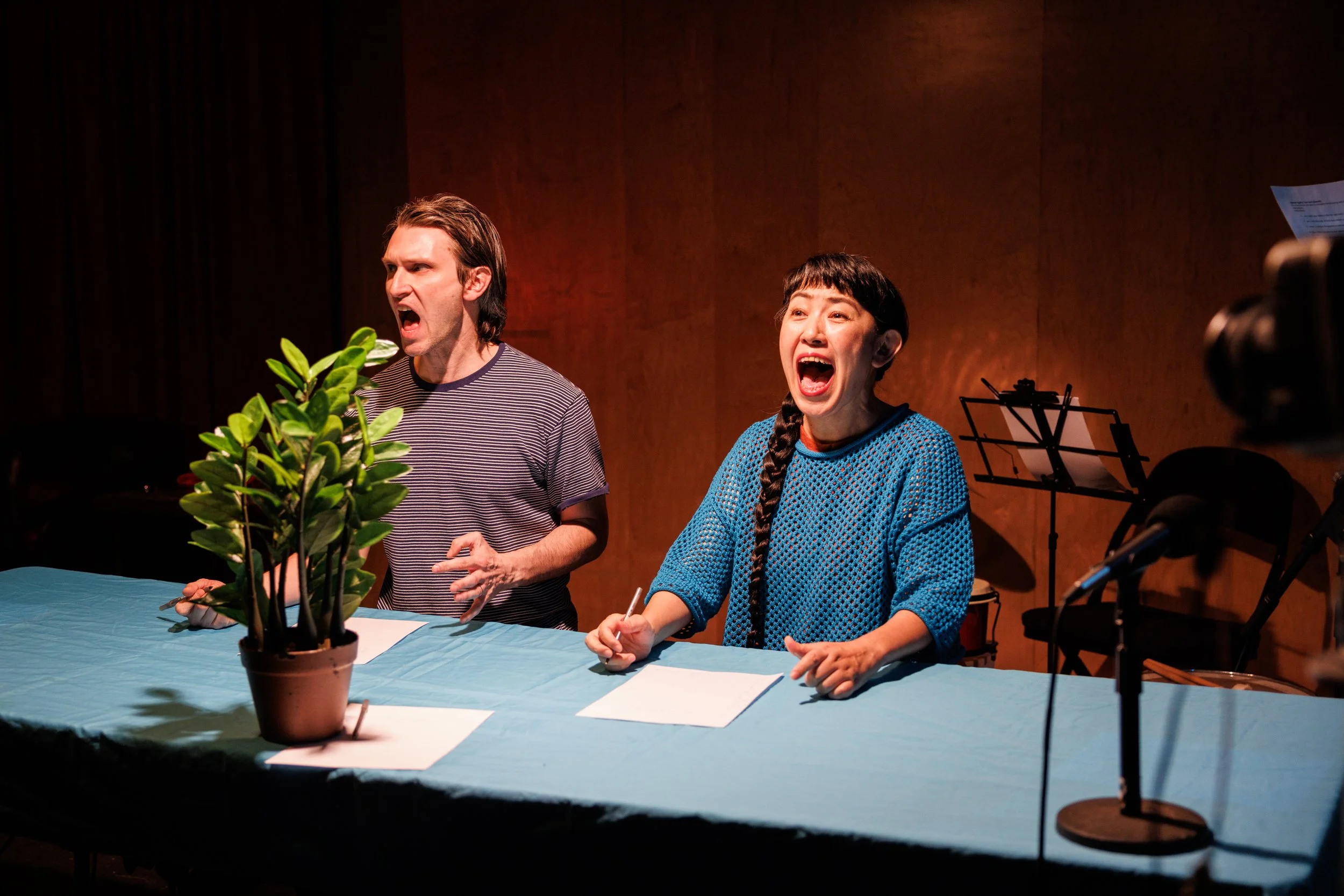 In March 2026, Object Collection presents a multimedia collage of live art, music, expanded cinema, theatre, performance, an anxious glitch clown clutter, a tone poem, a Fluxus score, three houseplants, a fever dream, an out-of-tune piano through a broken megaphone. We watch a movie screen. But overhear and catch glimpses of the construction of the video images we’ll see. Performers drag tripods and cameras and mic stands to corners of the space just out of eyeshot, until the camera blinks on into live feed, and we are in an interrogation, or a space-age dance break, or a very loud and strange meeting with HR. We know something’s happening right over there, but are only able to experience it via the lens and projection. The players are actors, stagehands, boom operators, cinematographers, puppeteers, musicians; they are taking the plane apart on the runway, and dismantling it still, as it flies.